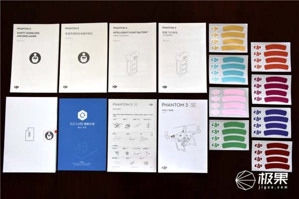 资料包中的内容包括中英双语的免责声明和安全操作指引以及智能飞行电池安全使用指引,DJI CARE换新计划宣传页、物品清单、快速入门指南,另外还附赠了8张DJI LOGO和机身贴纸。