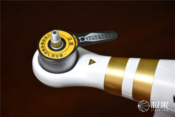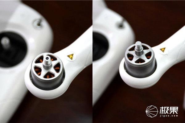 在每颗电机的上方都套有一条提醒注意的小纸条,提醒用户在起飞之前确认螺旋桨已经旋紧,另外螺旋桨帽的颜色要与电机螺纹上的颜色相符。具体来说,黑色桨帽的螺旋桨要安装到有黑点的电机轴上,银色桨帽的螺旋桨要安装到没有黑点的电机轴上。