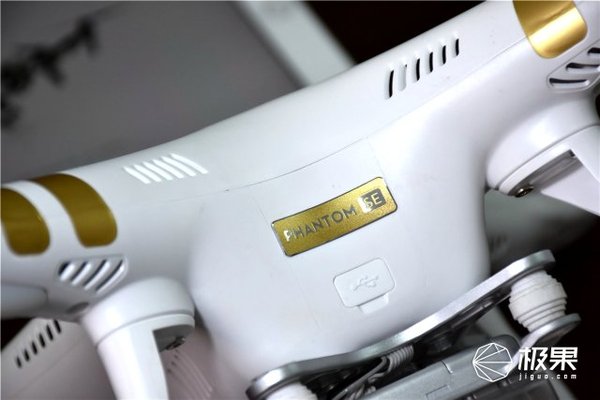 机身的主配色采用了金黄色,和P3P的配色完全一致。机身真面则标注有PHANTOM SE的机型字样,其下方是一个Micro USB接口,用来将飞行器和电脑相连。