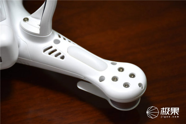 旋翼底部各有一颗LED指示灯,机头部分的是机头指示灯,机尾部分的是飞行器状态指示灯。电机下方的螺丝均可拆卸,用户是新手的话可以在这里安装保护架。
