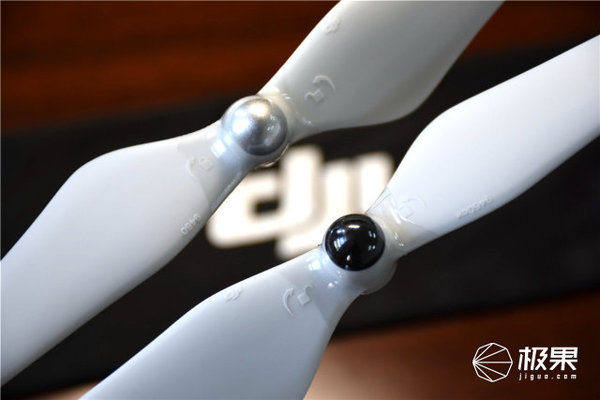 桨叶中心的两侧分别用浮雕式的设计标注了螺旋桨锁紧和解锁的旋转方向,作为一款入门机型,P3 SE的螺旋桨仍然是自紧桨。