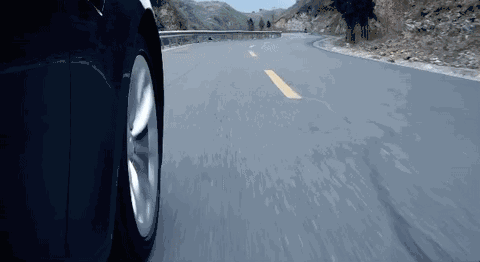 视频中有一个一闪而过的画面不知道你留意到没有:镜头贴近地面俯拍轮胎的高速转动和路面向后飞驰而过的场景。通过汽车的主视觉表现汽车移动速度之快。
