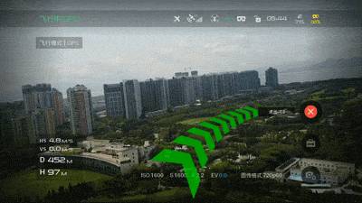 Mavic Pro最新的固定翼模式与DJI Goggles体感模式叠加使用,开启体感模式后在固定翼模式下飞行,你就能以第一人称视角(FPV)体会盘旋或滑翔般的逼真感受。同时,借助AR轨迹辅助线,配合体感控制飞行器飞行方向以保障飞行安全。