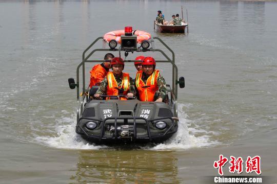 图为新型装备水陆两栖消防车参与抗洪抢险救援演练。