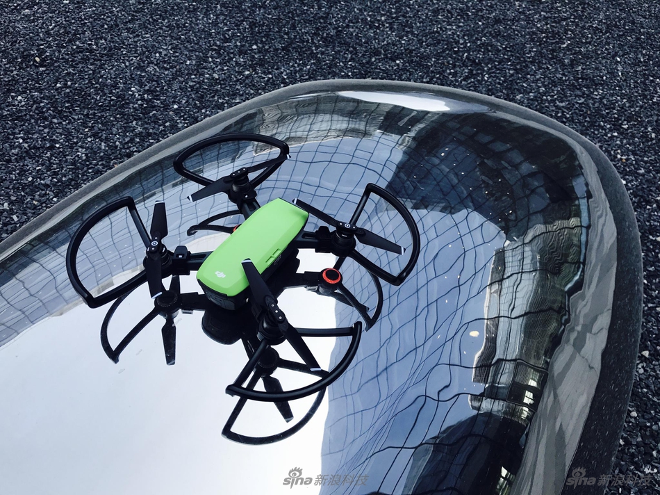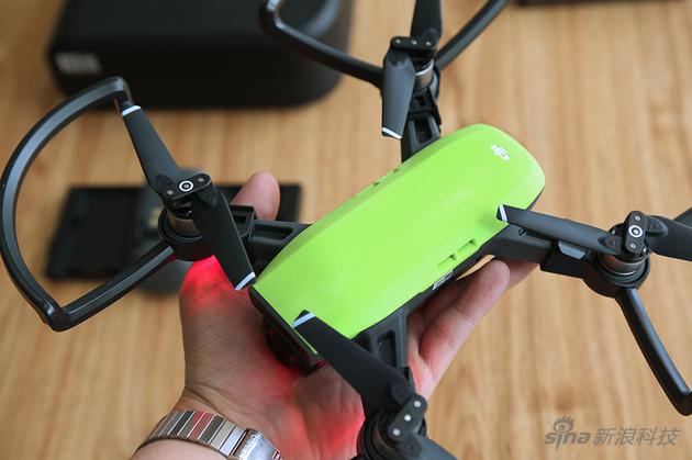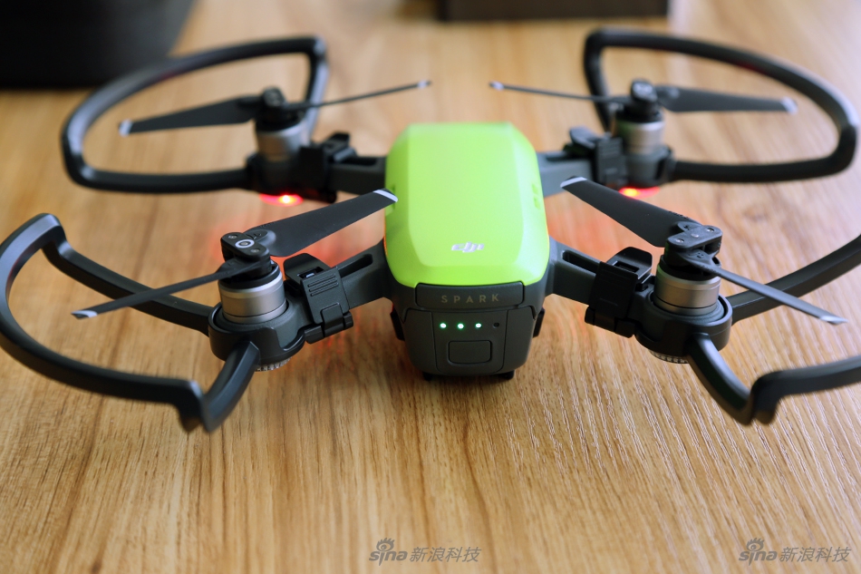 这款大疆最小的无人机有红黄蓝绿多种色彩,我们收到的是一台绿色版本。大疆刻意使用了这种多彩设计,让它“显得不那么专业”,这跟它的定位也有关系,负责自拍的SPARK更倾向于娱乐功能,而不是Mavic Pro那种便携+性能的代表。