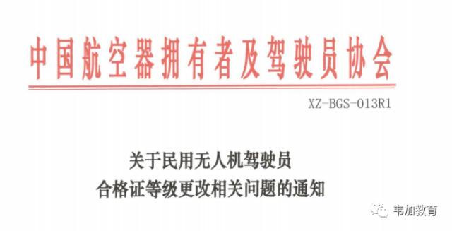 中国航空器拥有者及驾驶员协会(中国AOPA)无人机管理办公室近日下发《关于民用无人机驾驶员合格证等级更改相关问题的通知》。