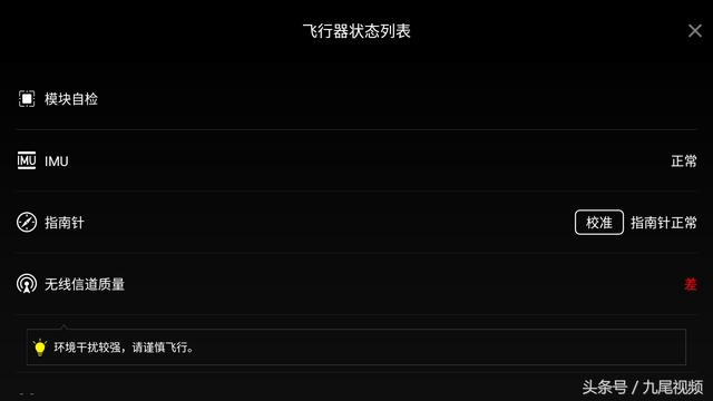 其中磁罗盘如果有异常现象,则需更换起飞地点或对磁罗盘进行校准,具体校准步骤不同无人机有所不同。