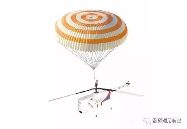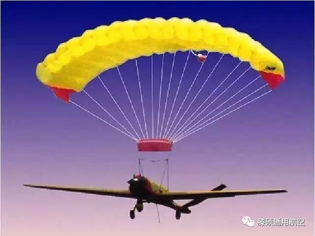 这是一种较普通的回收方式。降落伞由主伞和减速伞(也称阻力伞)二级伞组成。当无人机完成任务后,地面站发遥控指令给无人机,使发动机慢车,飞机减速,降高。到达合适飞行高度和速度时,开减速伞,使飞机急剧减速,降高,此时发动机已停车;当无人机降到某飞行高度和速度时,回收控制系统发出信号,使主伞开伞,先呈收紧充气状态,过了一定时间,主伞完全充气;无人机悬挂在主伞下慢慢着陆,机下触地开关接通,使主伞与无人机脱离。