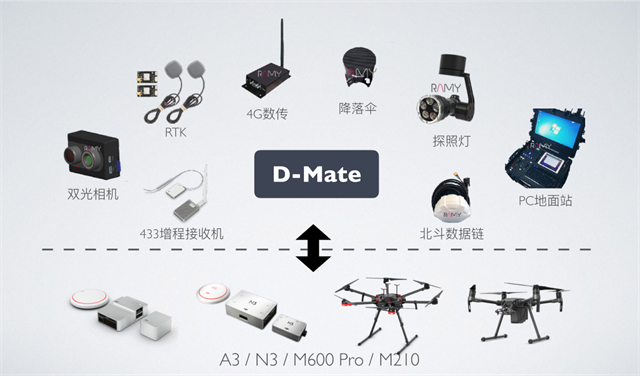 睿密D-mate(大疆伴侣)其主要目的是为了有效的解决行业用户在选择无人机时遇到的一些痛点。D-mate可使用于那些客户使用大疆专业级飞控如(A3)的需求,在保证安全可靠性的前提下同时拥有高水准的飞行,并且可同时支持扩展全部的大疆配件,如云台相机、RTK系统、冗余避障系统、Lightbridge高清图传等。此外,D-mate还可以使之方便的介入第三方无人机配件,如降落伞、4G数传、地面站、RC控制增程等,从而满足不同客户的需求。