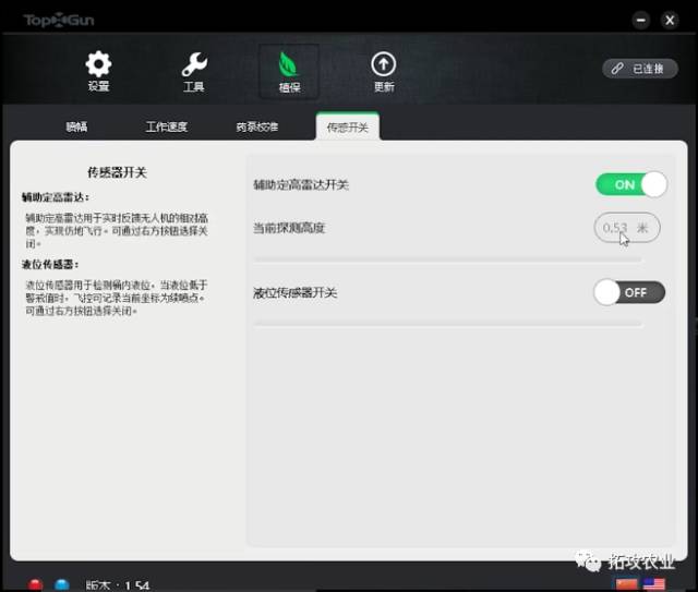 最后一步,在调参软件中打开位于植保一栏下的辅助定高雷达开关,就可以正常使用红外地形跟随雷达了。