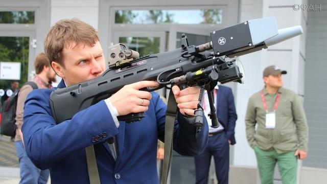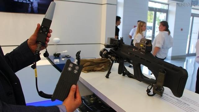 这款新装备的被命名为REX-1电磁枪,可以通过抑制移动通信信号和阻断无线通信,来捕获或者是控制无人机。图为卡拉什尼科夫公司人员展示这款新装备。