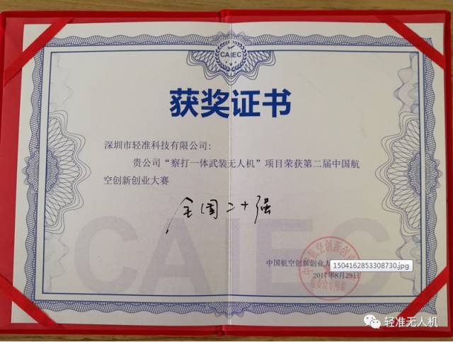 在第二届中国航空创新创业大赛复赛中,深圳市轻准科技有限公司拥有自主知识产权的察打一体武装无人机,从161个航空项目比赛中,荣获全国二十强!