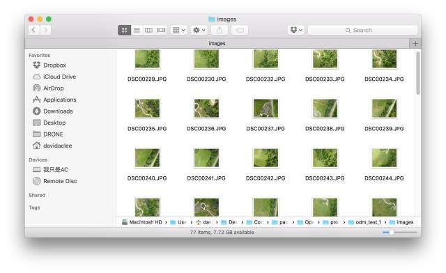 接下来,就需要把你需要进行处理的航拍影像拷贝到 images 文件夹中了,如果你暂时没有这些航拍图像的话,可以在https://github.com/OpenDroneMap/odm_data上下载范例素材。