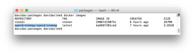 Docker 就会从 Docker Hub 中下载 OpenDroneMap 的镜像到本地中。为提高下载速度,建议提前使用 Proxifier 之类的工具(建议自行 Google)让 Terminal 走上代理道路。镜像下载完成后,在 Terminal 输入docker images指令,就能查看到刚才下载的 OpenDroneMap 的镜像了。