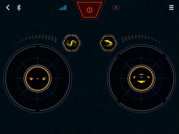 飞行模式的具体操作界面如下图。左边的虚拟摇杆对应的是无人机的上升下降,右边对应的是前后左右的前进,上边的三个小按钮从左到右分别对应空中翻滚、晃动和水平绕圈,下面的方块则是降落命令。基本上所有的操作都可以在这个界面中完成。