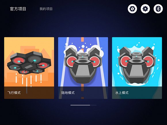 打开应用主页,当中已经默认设置了三个模式,分别是飞行模式、陆地模式、水上模式。安装好的无人机对应的是飞行模式。