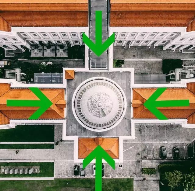 主体处于中心位置,而四周景物呈朝中心集中的构图形式,能将人的视线强烈引向主体中心,并起到聚集的作用。具有突出主体的鲜明特点,航拍中较适用于建筑拍摄。