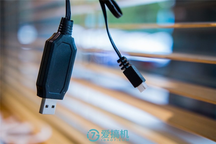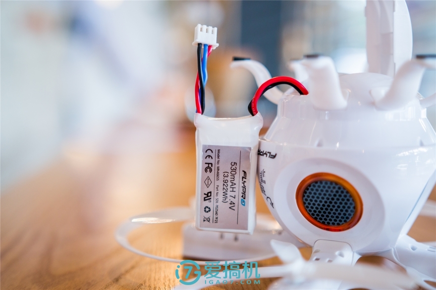 电池方面比较简单粗暴,直接采用线缆进行连接。这是一块容量为530mAh,电压7.4V的锂电池,可以提供约6-8分钟的续航,充电时需要将电池从机仓内取出,充电时长大约为1小时。