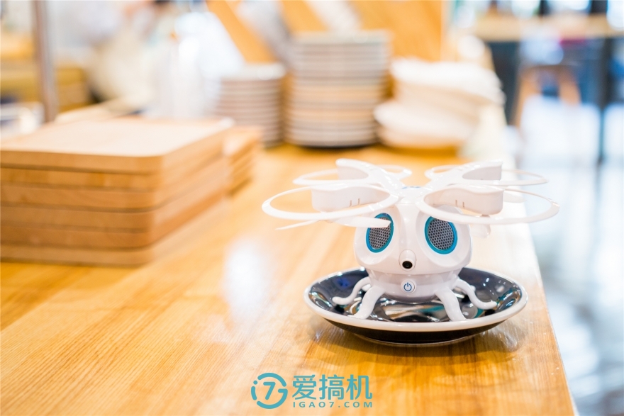 结构方面,其采用的是比较常见的四轴飞行器的设计,但为了还原电影中的设定,机身采用了十分卡通的设定,几个硕大的眼睛,再加上摄像头和电源开关,远远看过去,就犹如卡通版乌贼般,为了更加还原“乌贼”的形象,还特意设计了六只类似乌贼触手的弧线脚架。