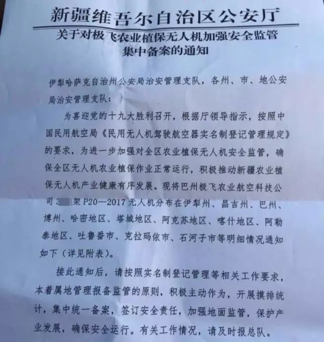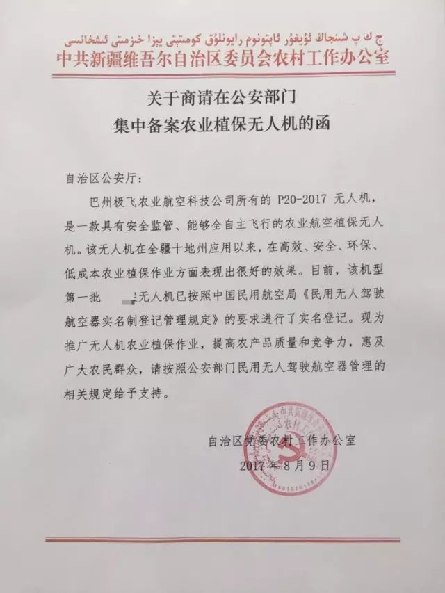 今年 8 月 9 日,极飞就已经完成了这批无人机的全部集体备案工作,顺利配合了政府的工作,成为了全疆唯一集体备案的植保无人机。