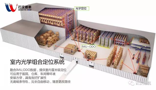 云汉通航自主研发的光学组合定位方案,通过光学转角测量定位、惯性导航、车轮等传感器进行地图匹配,实现厘米级室内车辆定位功能,能够适应复杂光线、遮挡等环境,无需布置引导线,即可实现无人车导航、有人车辆监控等功能。