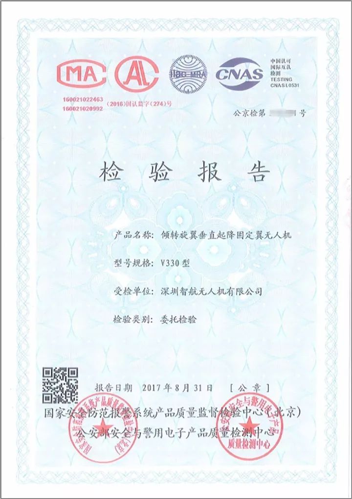 国庆中秋长假回来,智航便迎来一个振奋人心的好消息,就在九月份智航全新产品V330型倾转旋翼垂直起降固定翼无人机,已通过了公安部第一研究所的无人机专业性测试—国家安全与警用电子产品质量检测。