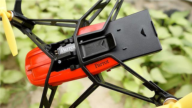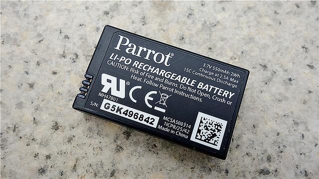 电池的固定非常稳妥,其背面有三个突起,可卡在机身对应的三个凹槽内,能保证飞行时称定供电。Parrot无人机身上的品牌标识非常多,不仅电池上有,机身上有,甚至机身内部的电路板上也有。品牌辨识度极高。