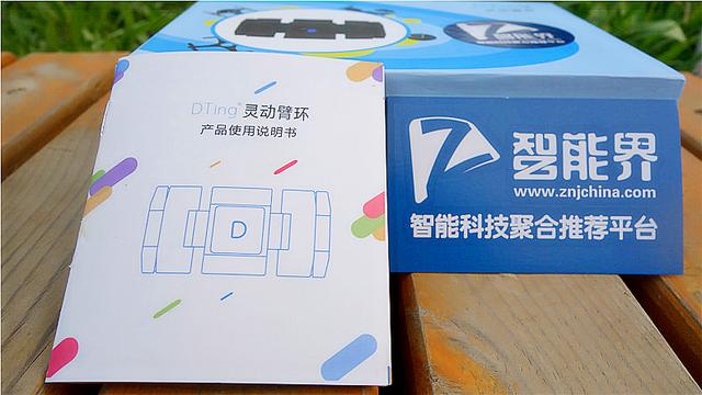 包装盒为纸制,采用天地盖式设计,上盖侧边底部有2个半圆形打开孔,可方便取下上盖。盒内物品摆放整齐有序,左侧是纸制的产品说明书,右侧就是黑色的DTing灵动臂环了。