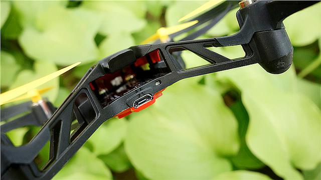 BLAZE迷你无人机的尾部是放锂电池的电池仓和USB充电口,充电口旁边还有一个LED指示灯,充电时为红光,充满后变成绿色。