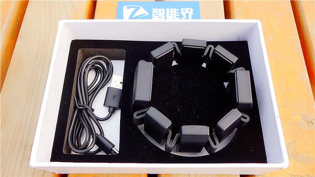 取出说明书后,露出了下面的充电线。充电线和臂环被放置在黑色泡棉的凹槽内,左方右圆,创意十足。不仅能提供优秀保护,而且各居其位,整齐美观。