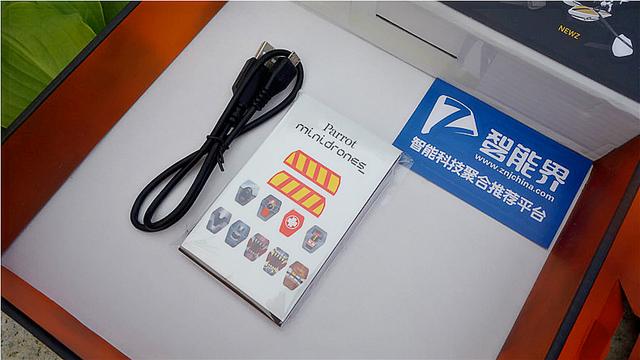 无人机下方是充电线和粘贴在盒子底部的配件袋。袋内装有美化贴纸和产品说明书。充电线为标准设计,一端为标准USB公头,另一端为Micro USB插头,黑色线缆线长约0.5米,主要用于为无人机充电。产品说明书为整页纸设计,上面罗列了多国语言文字,内容极具参考性。