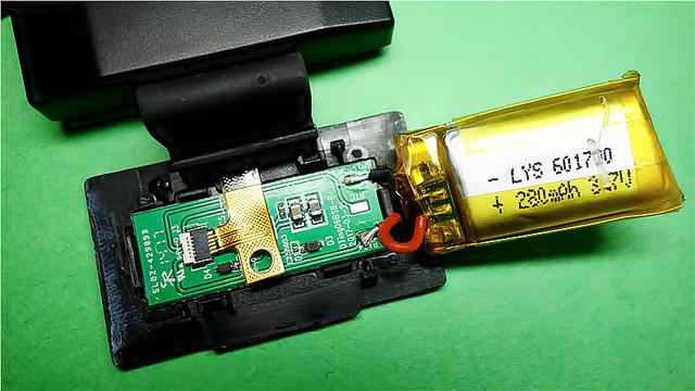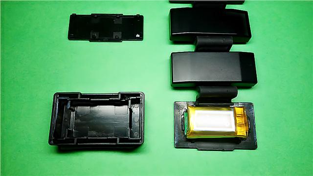 电池仓除了卡扣,还使用了粘胶。由于两侧连接部位未完全封闭,因此留下了拆解空隙。打开后发现,上面是一块聚合物电池,下面还有一块绿色的电路板。