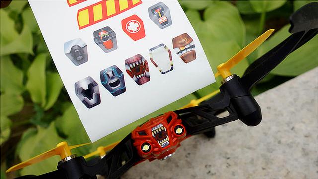 BLAZE迷你无人机的正面是一幅凶神恶煞的造型,还可通过更换贴纸,打造属于自己的造型。面部上方是两个小方形LED指示灯,可发出红、绿双色灯光,主要用于指示蓝牙连接状态;下方两个大圆形是前置照明灯,适用于夜间航行,而且还具备闪烁等灯光特效。