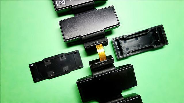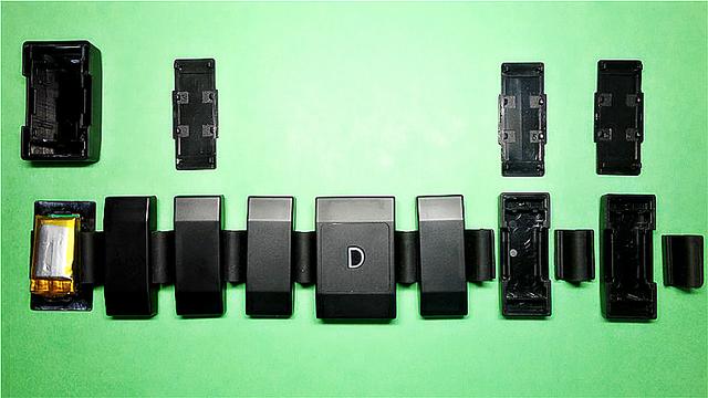 为了不影响臂环的功能,仅拆解了四个模块:左侧中间的小单元,发现了排线;最左侧的大单元,发现了内置电池;以及最右侧的2个小单元,空无一物,可供拆卸。