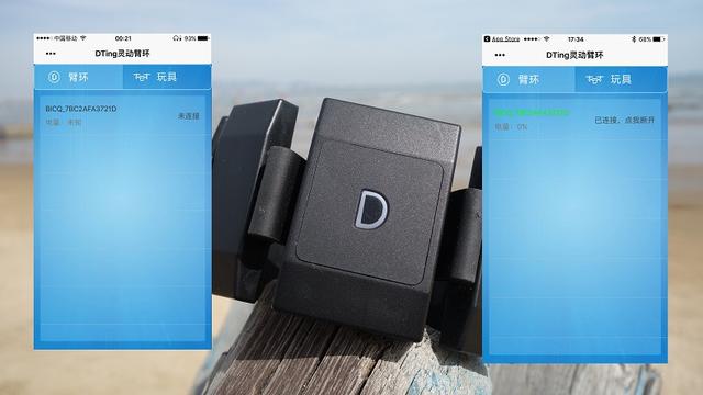 打开手机蓝牙,启动DTing灵动臂环后,手机APP臂环栏中会自动显示出附近设备名称,状态为未连接;点击臂环名称,即可自动连接,当设备名变成绿色后,表明连接成功,设备名称下方还会有电量的百分比显示标识;再次点击设备名称,可断开连接。