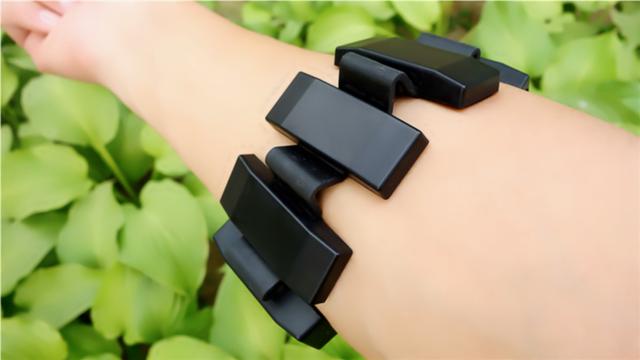 DTing灵动臂环的外观为未来感超强的“星际飞船”造型,8个传感器模块,通过弹性材料彼此相连,造型新颖,科技感强;并且在主模块上镶嵌了三段式电极片,保持与前臂皮肤表面紧密接触。