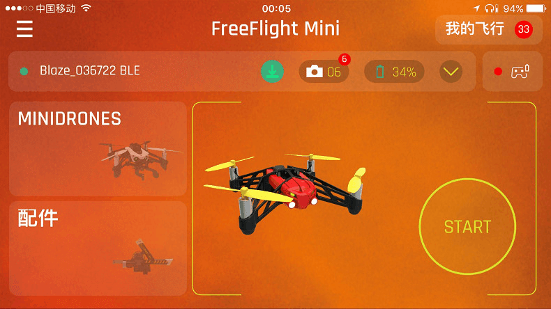 此外,BLAZE迷你无人机还有一款专用APP,名称为FreeFlight mini。该应用的下载、安装和使用也非常简单:在应用商店搜索上述名称,即可下载安装;打开手机蓝牙和无人机电源后,APP会自动搜索玩具并连接,连接成功后,操控界面会由灰色变成彩色,并可以实现无人机的操控。