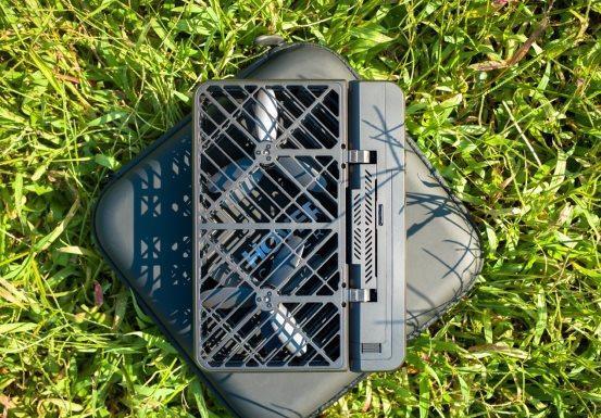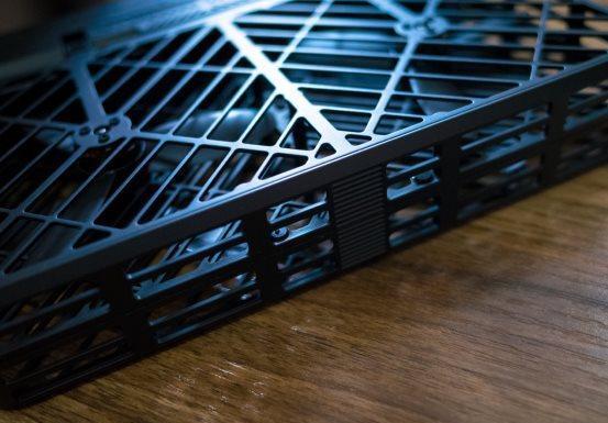与常见的无人机将旋翼裸露不同,小黑侠将旋翼用网罩全包裹,网罩使用碳纤维板CNC成型,产品仅重242克,在确保飞行安全的同时尽量减轻对续航的影响。