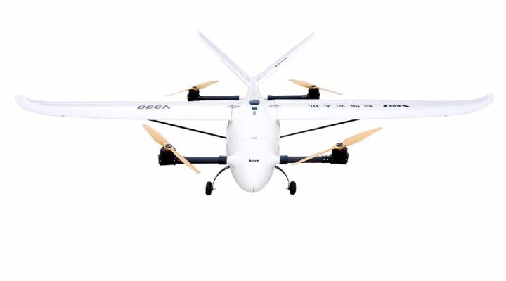 V330倾转旋翼垂直起降固定翼无人机,利用机载旋翼转换机构与稳定的飞行控制算法,实现多旋翼模式与固定翼模式的自主切换。在多旋翼模式下垂直起降,不需要借助跑道滑行,具有起降灵活、场地不受限的特点。在固定翼模式下大范围巡航飞行,具有续航时间长、巡航速度快、作业效率高等特点。