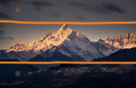 风光拍摄中最重要的一种构图方式是三分构图结合中心构图。画面前后采用前景、主体、远景三分构图体现层次,而左右则采用主体居中的中心构图。作者70%以上的风光佳作都采用这一种结合性的构图方式。