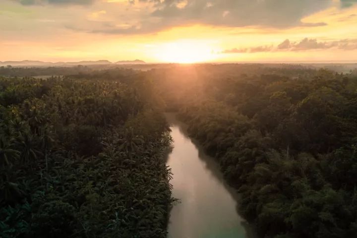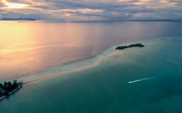 ②沙巴自然保护区的热带玉林日落,拍摄时下着小雨,虽然没有雾霾,但是水汽非常重,因此在日落时使用飞行器进行逆光拍摄。