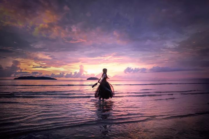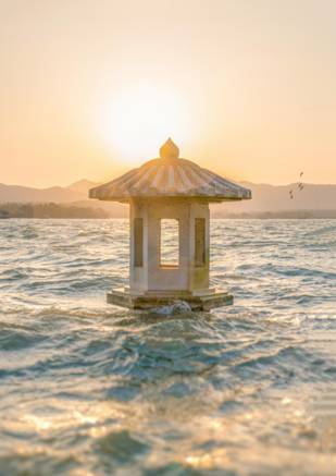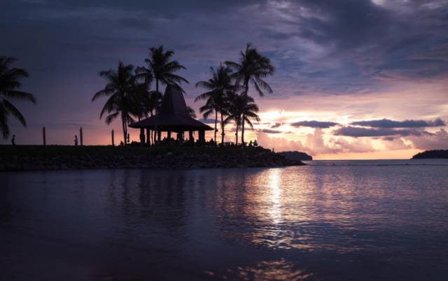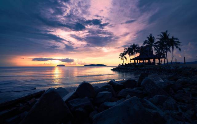 ①丹绒亚路海滩日落亭,采用大光圈快门拍摄使水面形成光斑,制造前景增加画面层次。