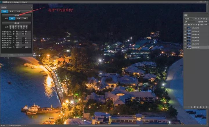⑦放大后可以看到单张图因为调整过阴影提亮,噪点非常严重,此时使用平均值堆栈(此处采用startails雪人插件,速度较快 )