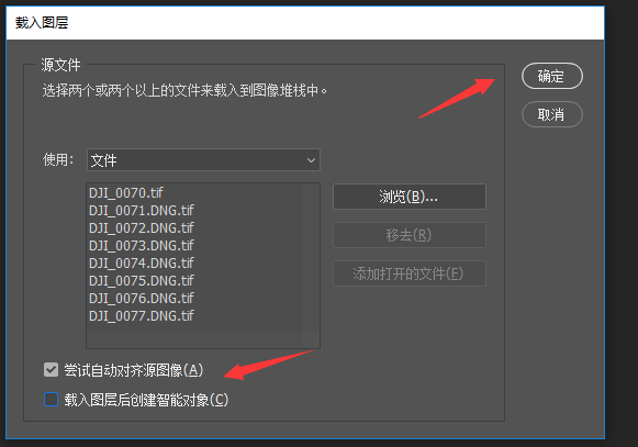 ⑥“浏览”并选择之前第4步保存的TIF ,勾选自动对齐图层并确认;