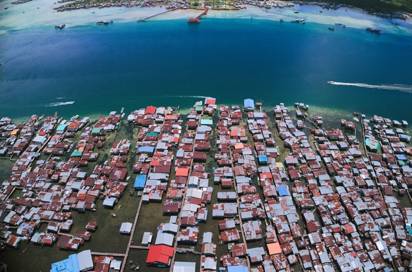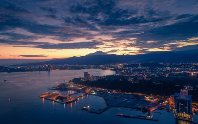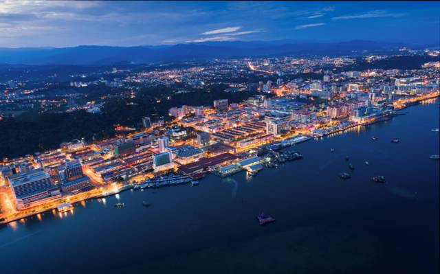 酒店屋顶起飞后利用北面的码头作为前景拍摄的亚庇市区日出