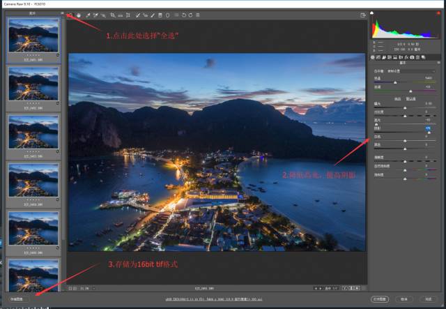 ①用CAMERARAW (lightroom)打开连拍的图像;