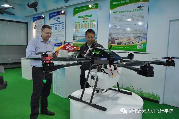 全球鹰无人机董事长余景兵给Rony先生介绍全球鹰10L蚌山二号植保机