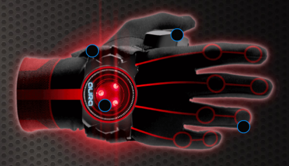 仿佛魔术师所佩戴的手套一样,它覆盖在一个具有弹性的手套上,可调节尼龙扣紧贴在手上。表盘呈圆形,控制器就在圆盘里面。首先,手掌平放,掌心向下,按控制器上的开关完成控制器和无人机的配对(应该通过蓝牙)。当控制器闪烁着彩虹的灯光,再变成稳定的绿色时,同时无人机上的灯变成蓝色,你就可以放心大胆的让Aura开始跳舞了。无人机根据你手势向前、向后、上下飞行。如果想让无人机在空中做翻转的动作,直接按控制器侧目的按钮。