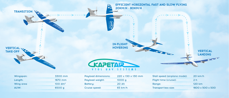 KapetAir 无人机的卖点是采用了倾转旋翼(tiltrotor),兼具直升机和定翼机的优点,原理与美军鱼鹰直升机一样:一方面,倾转旋翼无人机毋须依赖跑道升降(KapetAir 声称无人机能在水面升降),又能做到一般航拍机的空中悬停和空中盘旋的功能。另一方面,它也同时拥有更快的航速和更远的航程,大大提高无人机的应用范围。