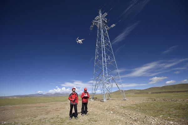 无人机在青藏高原的用途很多。据悉,“十三五”期间国网西藏电力实施西藏新一轮农网改造升级工程。为克服西藏海拔高、施工难度大等困难,使用无人机代替人力进行验收,实现对线路杆塔的全方位巡检,提高了验收质量和验收作业效率。图为工作人员在遥控无人机进行操作。图片来源:国网浙江电力)
